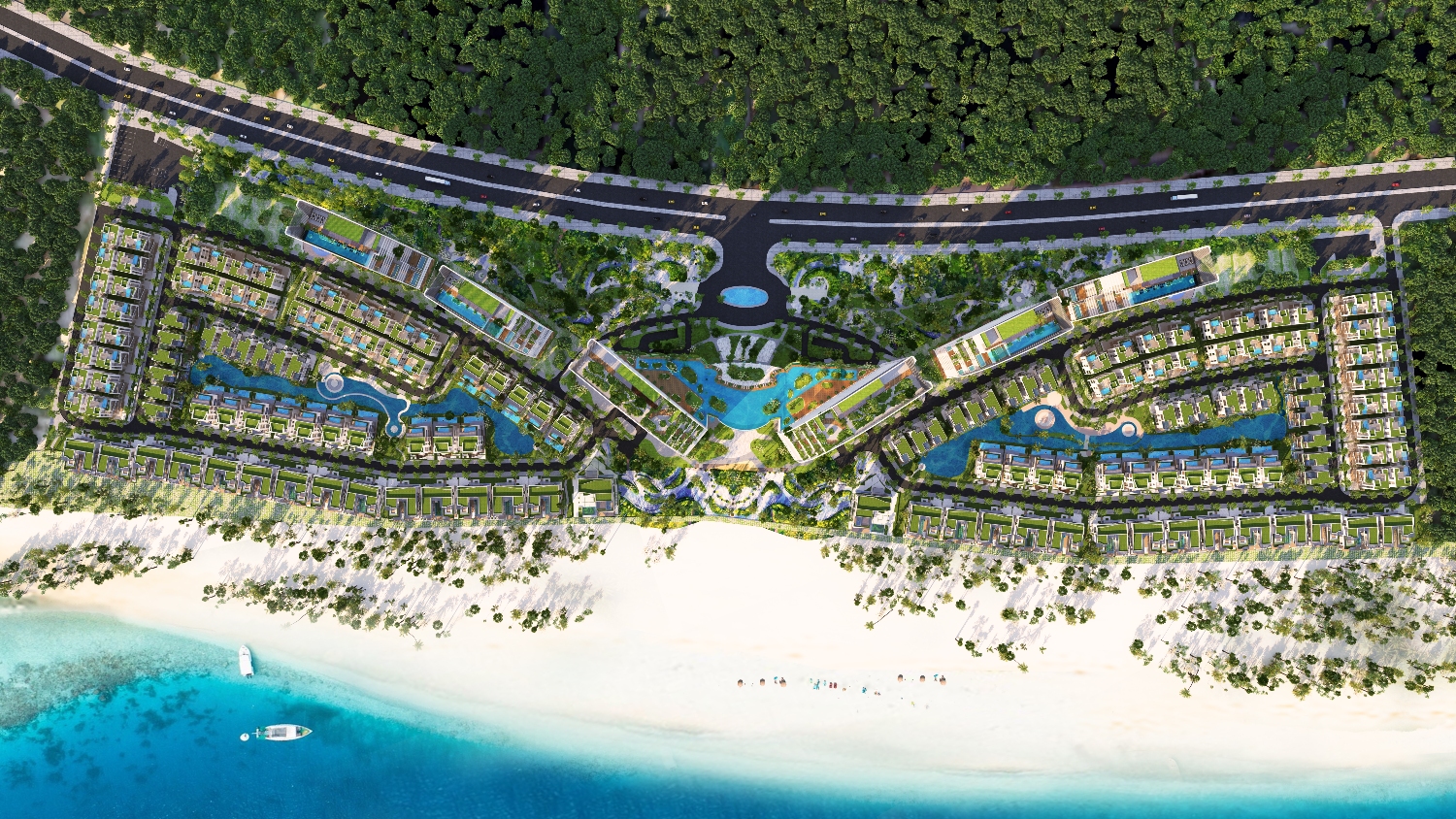 Khu thương mại thấp tầng được thiết kế theo triết lý “vừa nghỉ dưỡng – vừa trải nghiệm”, kết hợp mảng xanh, hồ nước và những tuyến phố mua sắm mang phong vị miền biển.