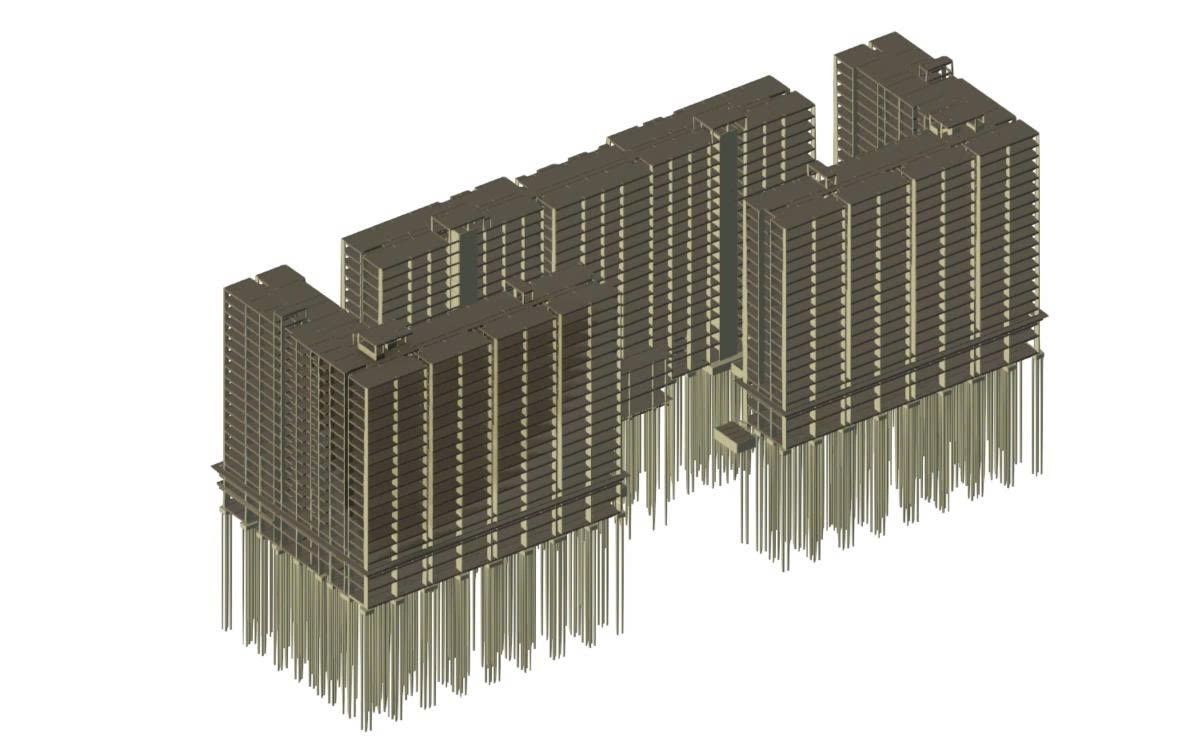 Mô hình kết cấu dự án Hòa Phú được triển khai trên nền tảng Revit – kiểm soát dữ liệu chính xác đến từng chi tiết cấu kiện.
