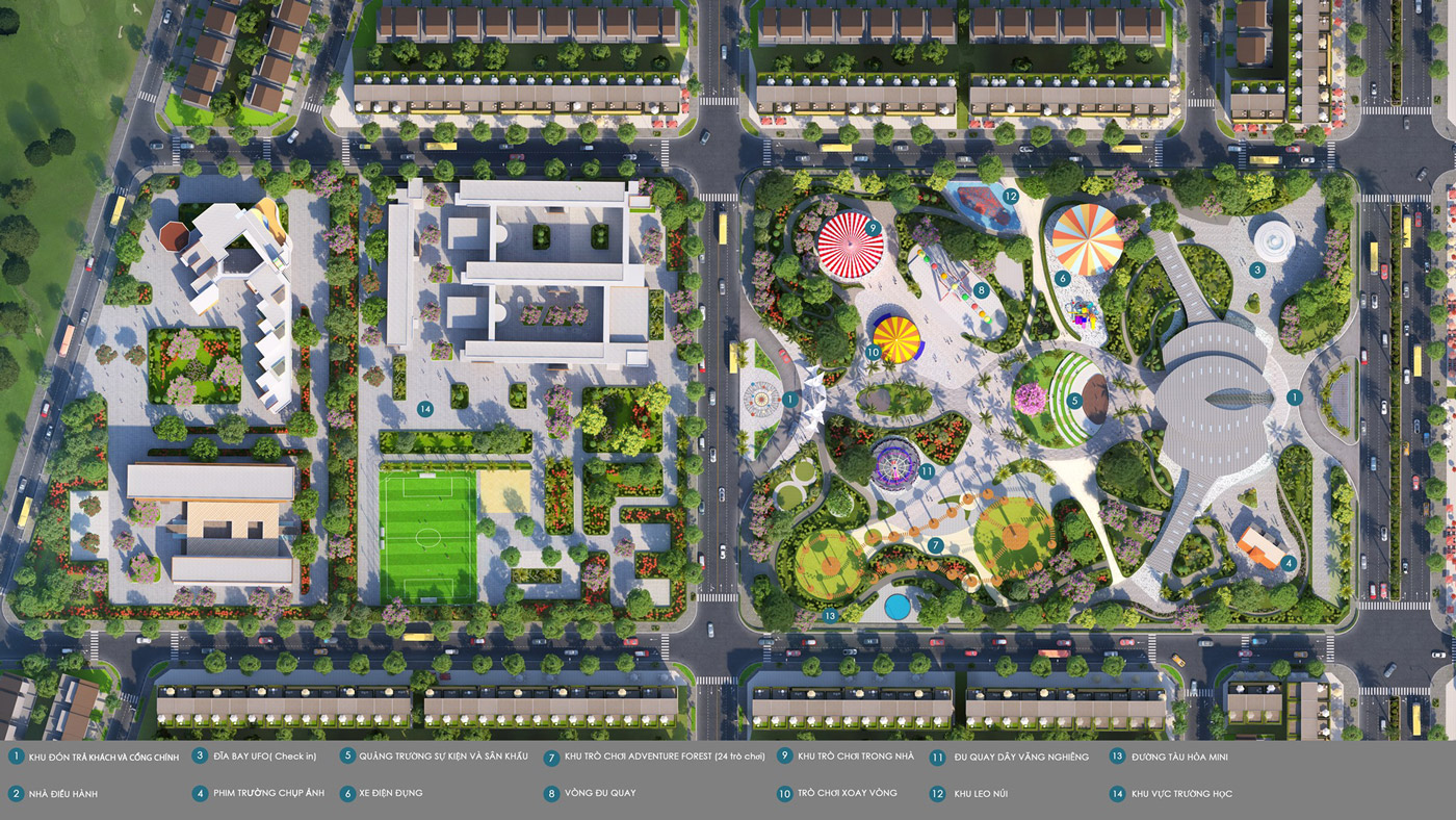 Gem Sky World được quy hoạch bởi Công ty CPG Consultants (Singapore) – một trong những đơn vị thiết kế quy hoạch hàng đầu châu Á. Tổng thể dự án chia thành nhiều phân khu chức năng rõ ràng: khu thương mại, khu nhà ở thấp tầng, cao tầng, trường học, bệnh viện, công viên trung tâm và các tiện ích cộng đồng. Mỗi khu vực đều được bố trí khoa học nhằm tối ưu hóa công năng sử dụng, đồng thời đảm bảo kết nối linh hoạt, giao thông thông suốt.