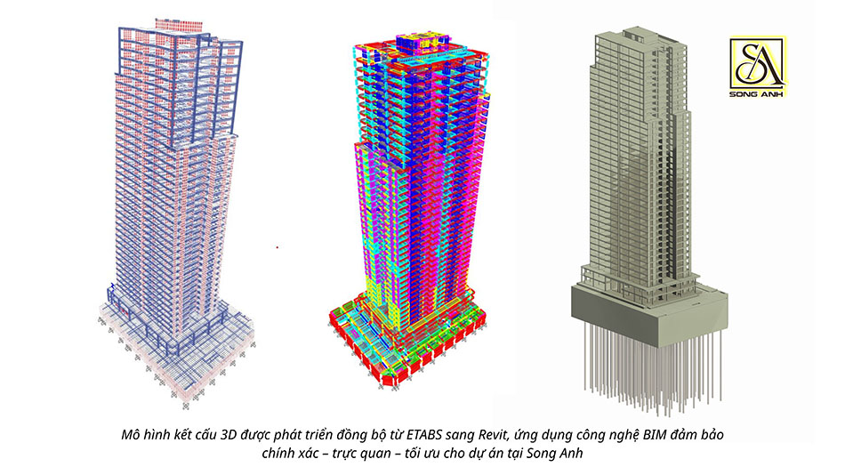 Tổng Thầu Thiết Kế Song Anh triển khai BIM theo hướng combine ba bộ môn ngay từ sớm, dùng Revit để phát triển model, Navisworks để rà soát clash, ETABS/SAFE phục vụ tính toán kết cấu và phối hợp ngược lại vào mô hình.