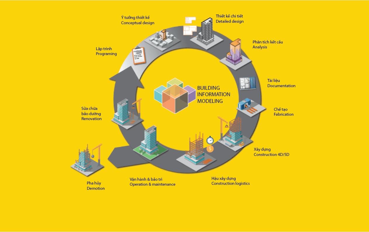 Building Information Modeling (BIM) là quy trình số hóa toàn bộ thông tin công trình, từ thiết kế, thi công đến quản lý vận hành. BIM sử dụng mô hình 3D thông minh để tích hợp dữ liệu về kiến trúc, kết cấu, MEP, giúp các bên phối hợp hiệu quả, giảm sai sót và tiết kiệm chi phí.